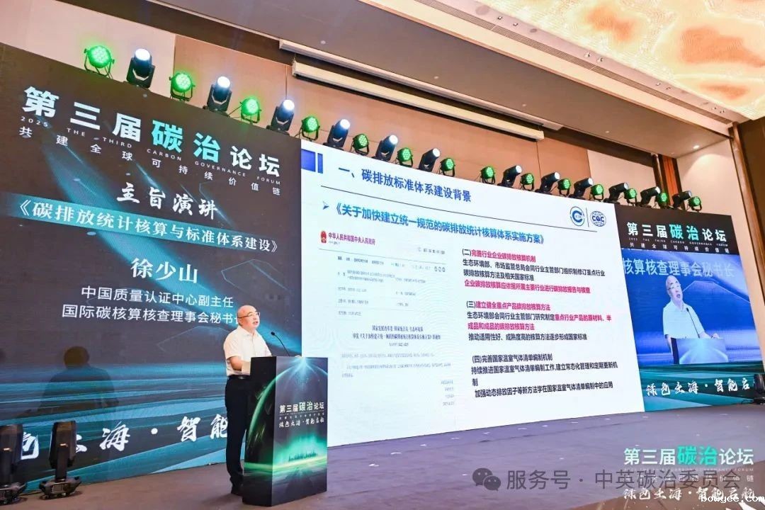 中国质量认证中心副主任,国际碳核算核查理事会秘书长徐少山发表了题为《碳排放统计核算与标准体系建设》的主旨演讲。徐少山介绍了国家从“能耗双控”迈向“碳排双控”的政策背景,系统阐述建立统一 MRV 标准、产品碳足迹体系与数字化能碳管理平台的路径,以支撑全国碳市场扩容和国际互认。