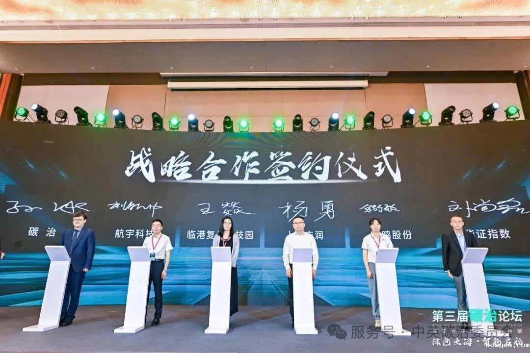 碳治(左一)与贵州航宇科技发展股份有限公司(左二)、上海临港九亭复旦科技园建设发展有限公司(左三)、上海吉润置业有限公司(右三)、宁夏晓鸣农牧股份有限公司(右二)、上海华证指数信息服务有限公司(右一)等上市企业代表以及上海华证指数信息服务有限公司代表分别签署战略合作协议,就ESG治理协同、数字化碳管理、可持续价值链、零碳园区/工厂建设及中英双碳示范项目等达成合作意向,助力构建可复制、可推广的可持续转型样板。