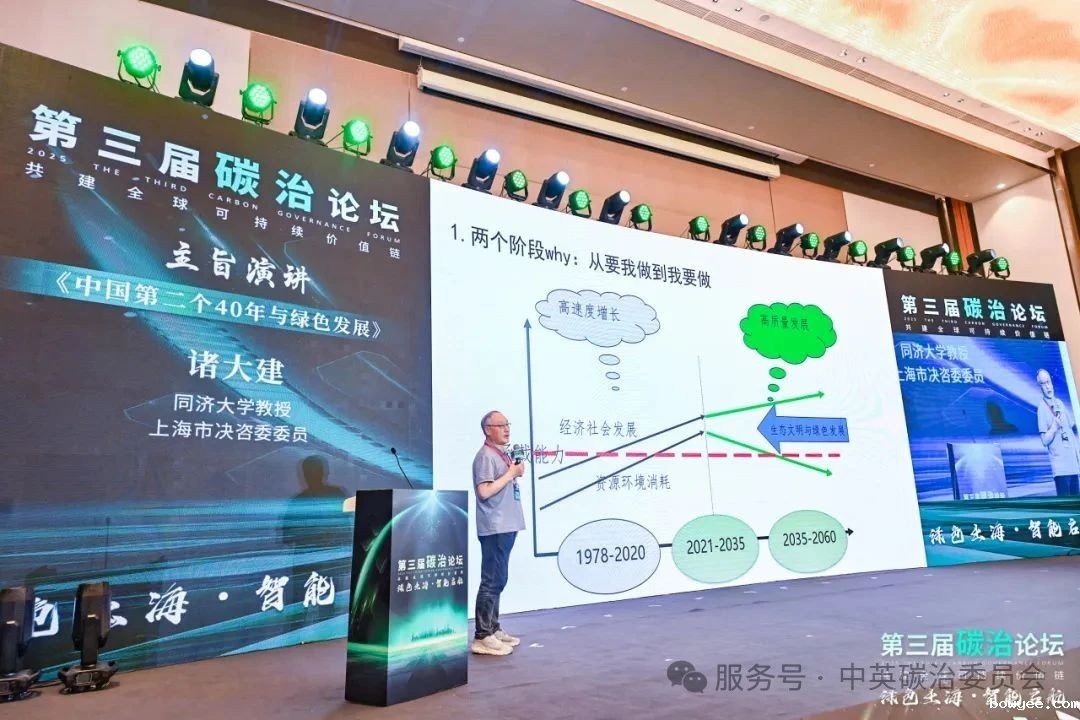 同济大学教授,上海市决咨委委员诸大建发表了题为《中国第二个40年与绿色发展》的主旨演讲。诸大建解析了中国绿色转型从“要我做”到“我要做”的跨越,强调在双碳目标下通过新能源产业化与产业新能源化“双循环”重塑经济体系,并以ICT“碳手印”示例展示中国在第四次工业革命中的先行优势。