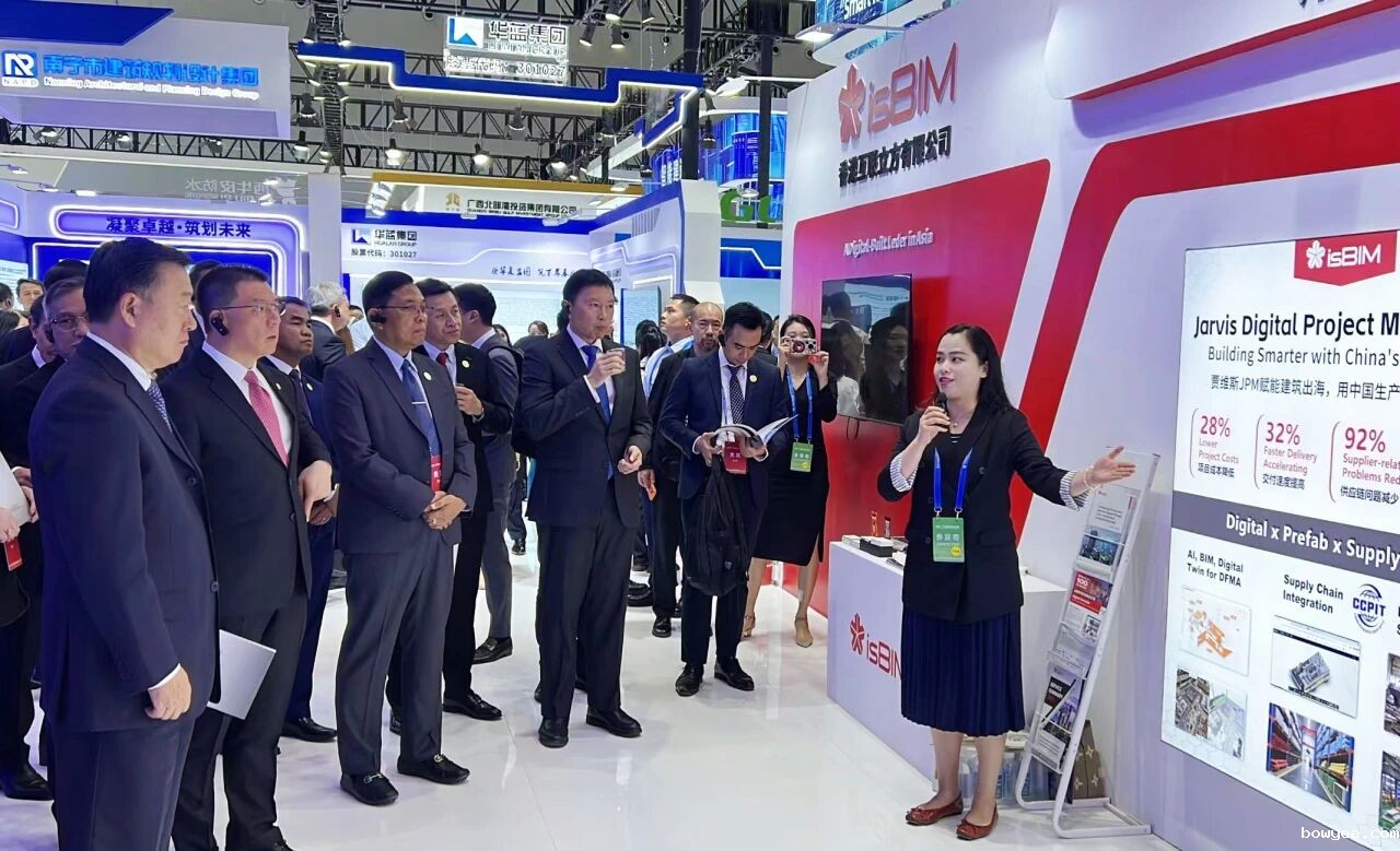 展会首日,住房和城乡建设部部长倪虹、副部长李晓龙,广西壮族自治区常务副主席许永锞,与文莱、柬埔寨、老挝、马来西亚、缅甸、菲律宾、新加坡、泰国、越南等东盟国家、东盟观察员东帝汶的建设部长和代表以及东盟秘书处相关人员莅临香港互联立方展位,听取了智能建造委员会办公室主任彭慧莲女士关于贾维斯JPM项目管理服务介绍,以AI数字平台+中国国际贸易促进委员会建设行业分会(CCPIT-CISC)优质供应链资源,打通跨境协作瓶颈,为建筑行业数字化升级与出海提供切实支持,将“中国速度”转化为可复制、低风险的全球开发新范式。视察团认真听取后,智能建造委员会联合香港互联立方打造的“中国建造PLUS”跨境解决方案给予高度认可,认为其切中了中国与东盟建筑合作的核心需求,充分体现了中国建筑工业化能力对全球城市建设的价值。