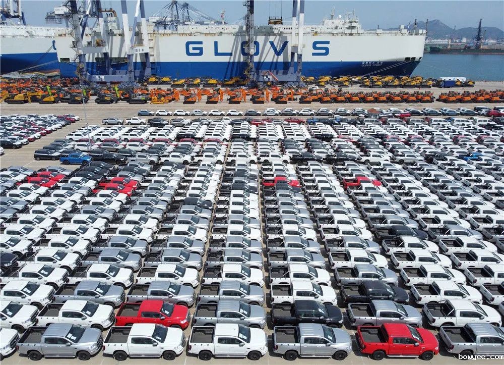 5月9日,大批出口商品车在山东港口烟台港集结等待装船(无人机照片)。新华社发(唐克 摄)